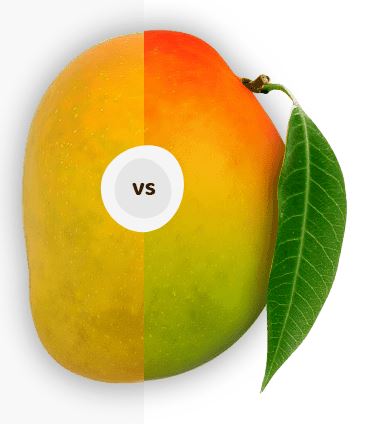 1️⃣ Natural Color Variations – A genuine Alphonso mango ripens gradually, showing a mix of yellow and green shades instead of a uniform color, ensuring it has matured naturally.